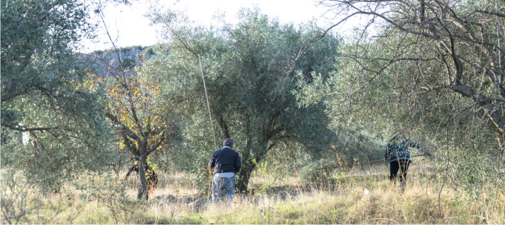 This particular olive grove is located on a fairly steep slope – and it survived last year’s brutal winter where the temperatures dropped to as low as -18C last winter, very well. There was a couple hundred yards of walking from where we left the vehicles to where we started harvesting olives. The goal for us that day, I’d learn, was that we were going to focus on the trees that were the easiest to harvest as a crew of professionals had been hired to do what was left. Depending on the weather, they were scheduled to start work approximately the following Tuesday, but with rain in the forecast, that could change.