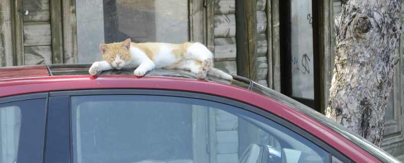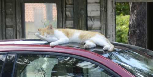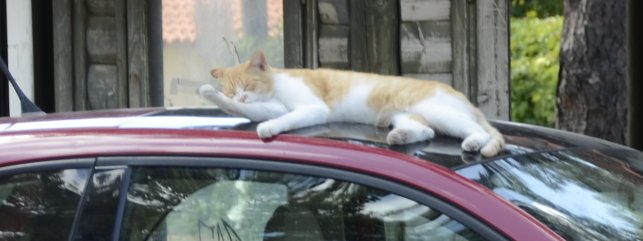 On our trip however, we found evidence that cats also own automobiles. On a quick stop in the village of Anakasia, which is above the city of Volos, we came across this cat obviously taking some pride in it’s shiny red car. As we got closer to the car, the cat seemed to have an expression on its face almost as if to be daring us to touch the car. Then it began to preen itself – obviously being satisfied in the shine of the red paint.