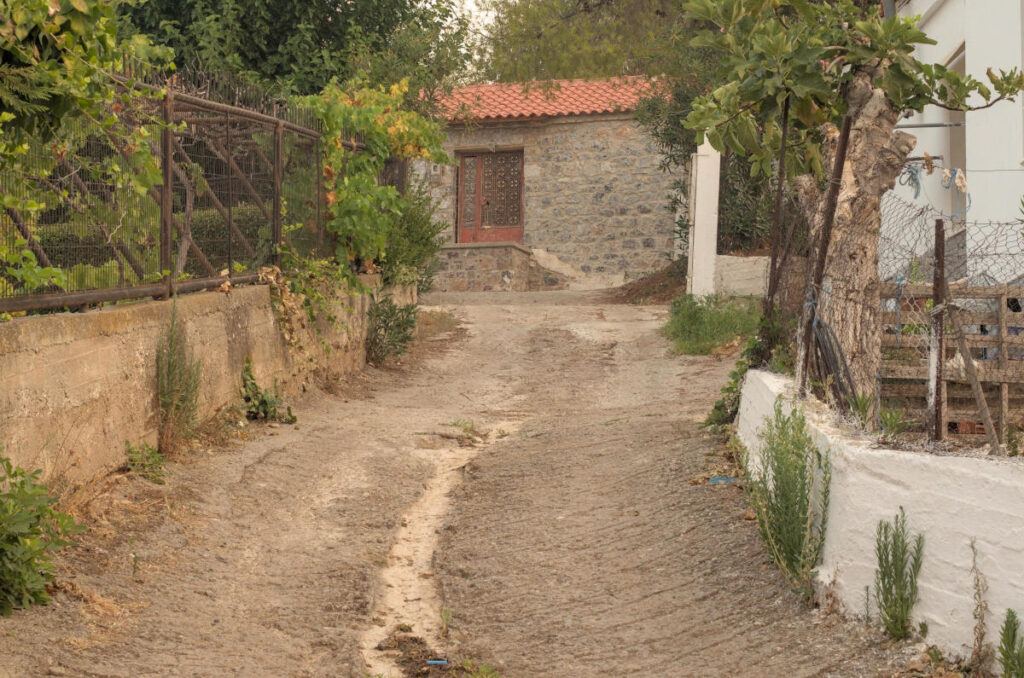 I had seen the house about half an hour before I took the photo, when I took my dog, Beans, out for a quick walk. But before I actually started on my walk, my view from the balcony of the house I am staying at also is worthy of some comment. Most Greek villages were built long before there was any idea of planning, that roads might one day be used for vehicular traffic (donkeys and carts were common), and there is not really a lot of space between houses. This photo does not show the “houses” right next door, but does show the view from the balcony looking across the small “square” that has barely enough room for the cars that are owned by the residents, or even visitors: