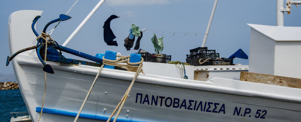 While walking through the port area, we came across a fishing vessel named the Pantovasilissa (ΠΑΝΤΟΒΑΣΙΛΙΣΣΑ in Greek, and pronounced like “Padovasilissa”). One of the things that struck me right away were fisherman’s clothes hanging to dry on the bow of the ship: