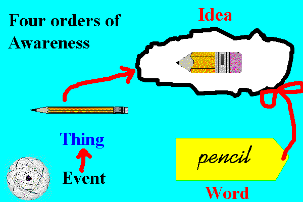 The thought or idea of a pencil in our mind is yet up another level of awareness, and then the word 'pencil' is higher still. Four orders or levels of awareness are involved in anything we talk about using words.